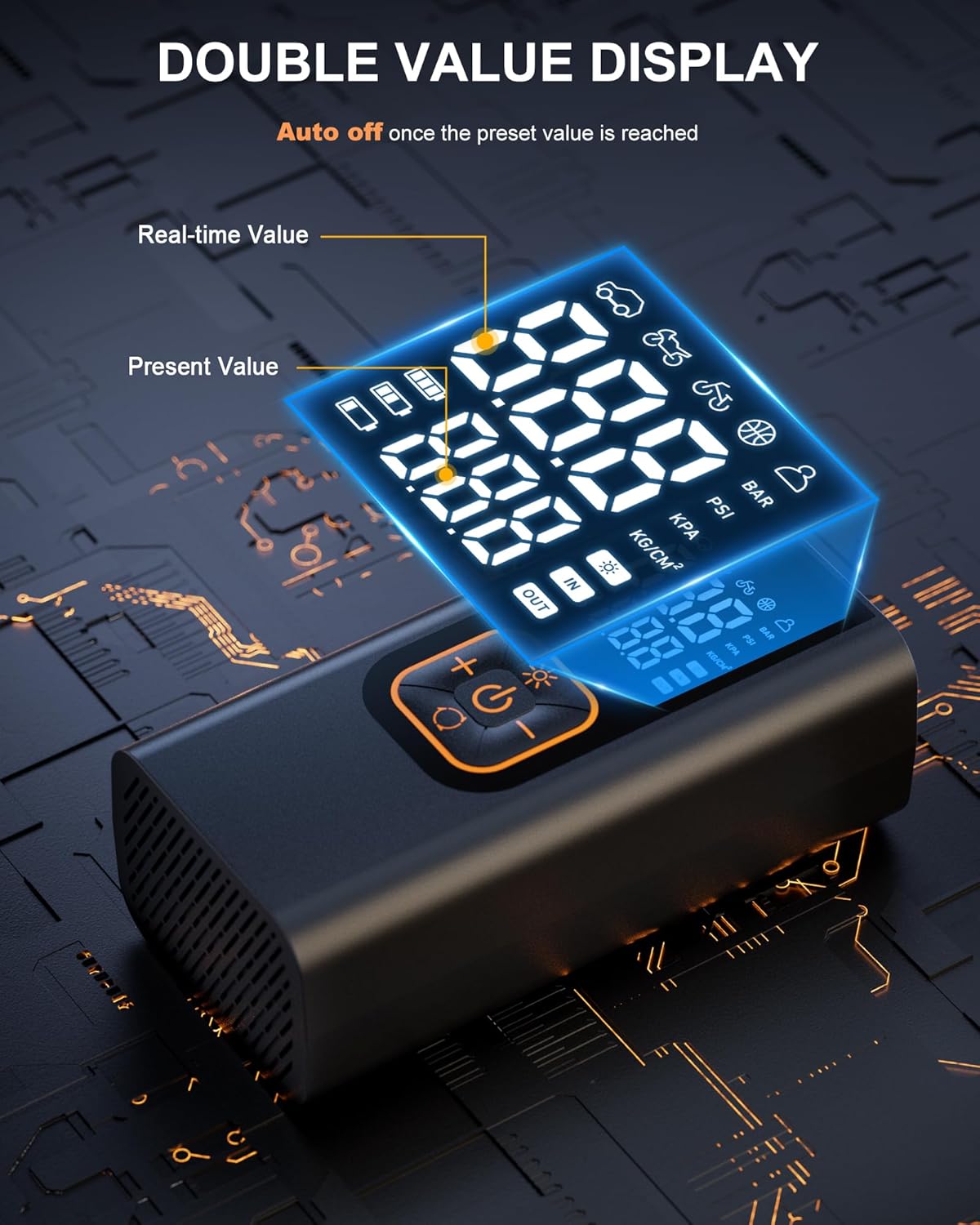 - [Dual Screen Display for Precision & Clarity] – This 12v air compressor for car has a dual digital LCD display that shows real-time pressure and preset values at the same time, making it easy to read and monitor digital tire pressure gauge. It also has a high-performance smart pump core, (with an accuracy of ±1 PSI).the large LCD screen ensures easy visibility of tire pressure values even in bright sunlight