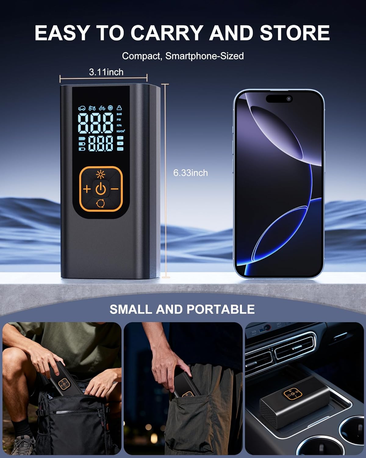 - [One-Click Operation & AUTO SHUT-OFF] – It offers 5 preset inflation modes (Car, Motorcycle, Bicycle, Ball, and a Custom mode up to 180 PSI) and 4 pressure units (PSI, kPa, Bar, kg/cm²). The accurate pressure sensor provides real-time monitoring and automatically stops when the set pressure is reached. It also powers off after 3 minutes of inactivity to conserve battery life and prevent overheating