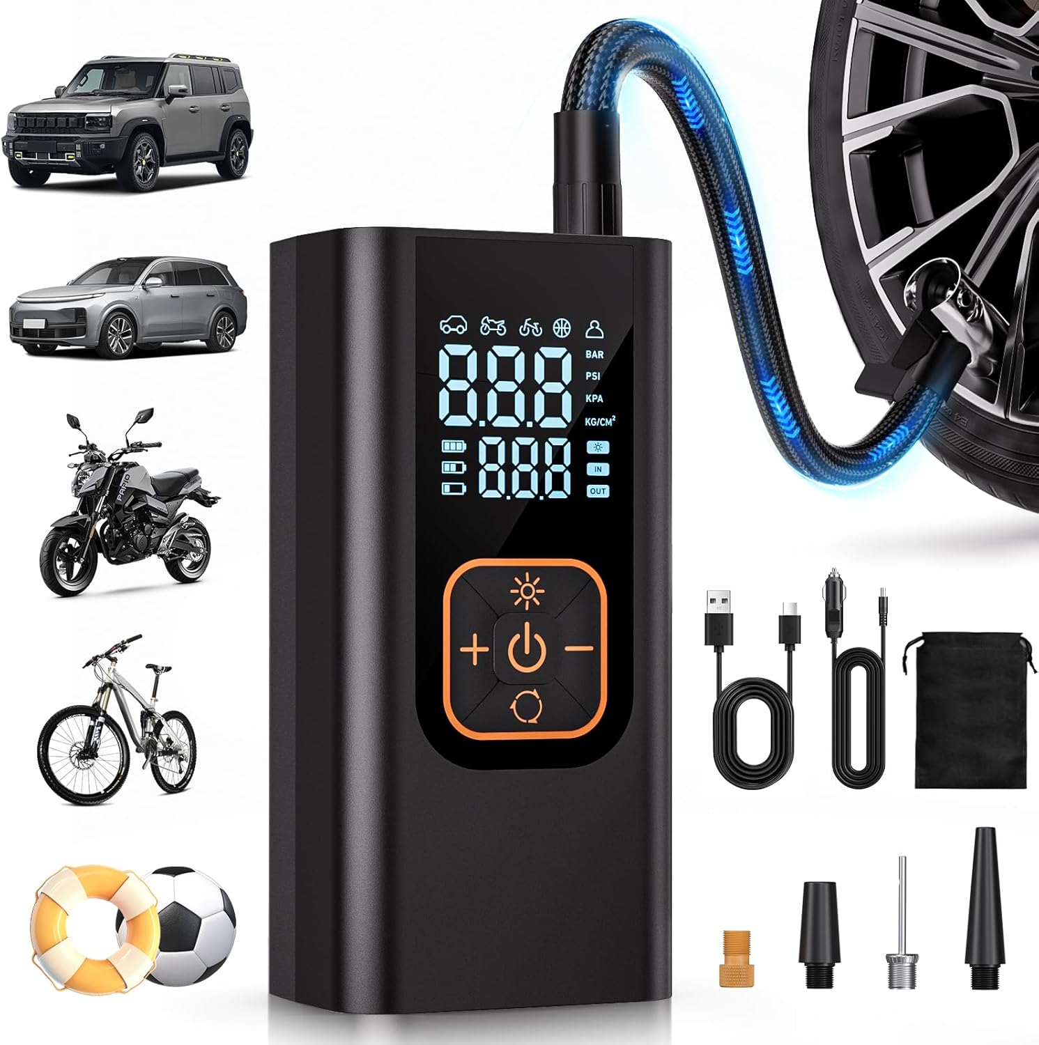 - [What You Get] – Portable tire inflator x1, Air hose x1, 12V DC car adapter x1, Tire nozzle x1, Presta valve adapter x1, Schrader valve adapter x1, Ball needle x1, USB-C cable x1, Storage bag x1, User manual x1. We offer 2 years of product warranty and lifetime technical support for added peace of mind