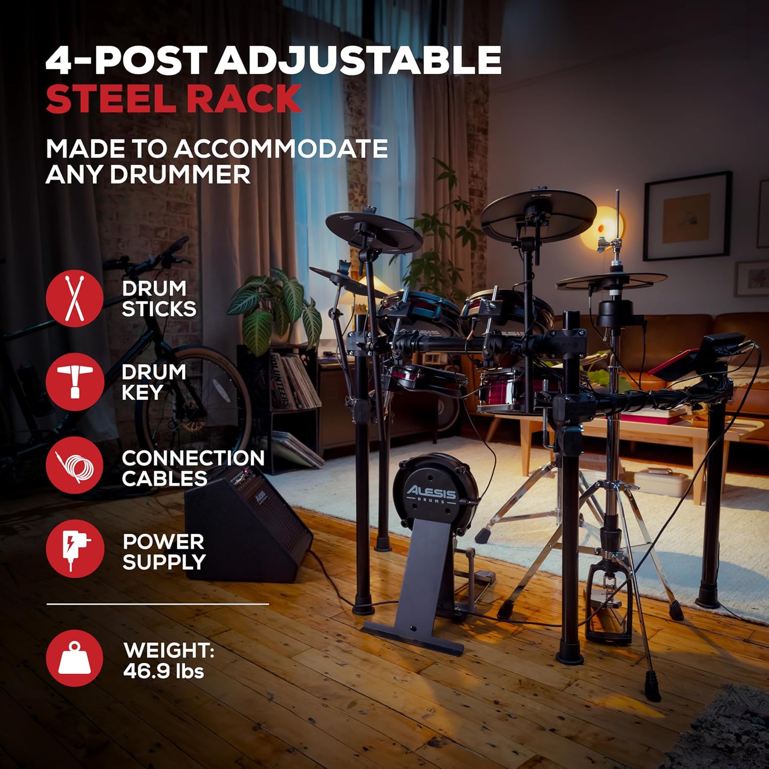 - Complete Percussion Experience – Stand-mounted 10″ hi-hat controller, 3x dual-zone 10″ cymbals with choke, ultra-quiet Alesis mesh heads, upgraded Drum Module with Bluetooth and BFD drum sounds