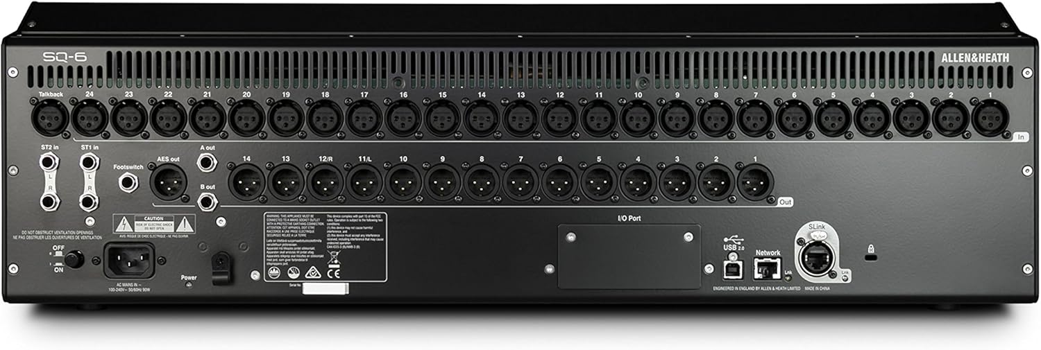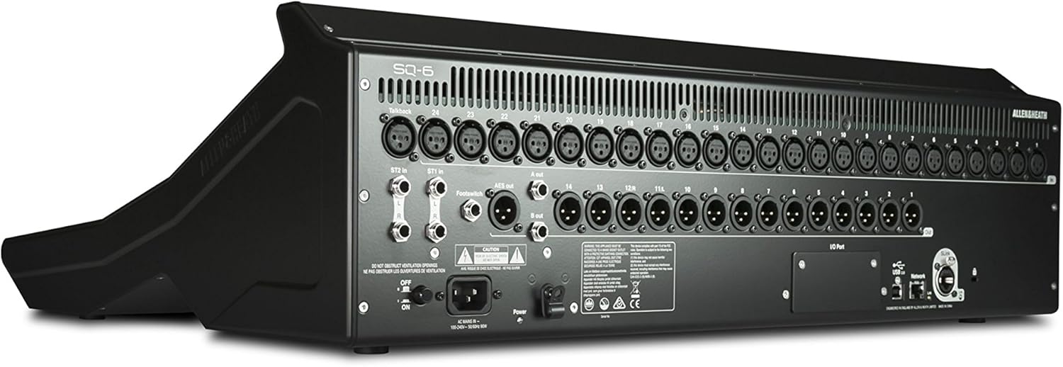 Allen & Heath SQ-6 Digital Mixer, 48 Input Channels, 36 Total Busses, 3232 USB Audio Interface, 7″ colour touchscreen, 24 Onboard Preamps, 25 Faders, 16 SoftKeys, 4 Soft Rotaries, AES Digital OutputKey Features48 Input Channels, 36 Total Busses, PAFL Bus, 12 Stereo Mix (Aux or Group) + Main24 Local Mic Inputs (XLR), 2 1/4″ Stereo Inputs (TRS), (1) 3.5mm Stereo Input, 16 Assignable Local Outputs (14 XLR + 2 1/4″ TRS)Dedicated Talkback mic input (XLR), 1/4″ TRS Headphone out with dedicated control, SLink EtherCON connection for remote audio using dSnake/ME, DX or GigaACE/GX protocol (128×128 channels)I/O Port for Option Card (including 3 rd party protocols Dante/Waves)8 Mute Groups, DCA Groups, 8 Stereo FX with dedicated FX ReturnsDEEP Processing Ready, RackFX Effects suite24+1 Faders with 6 Layers for 144 assignable Channel StripsSpecificationsMic/Line Inputs: Balanced XLR, fully recallableInput Sensitivity: -60 to +0dBuST1, ST2 connectors: Balanced, 1/4″ TRS jackST3 connector: Unbalanced, stereo 3.5mm Mini JackXLR Outputs: Balanced, XLRAES Digital Output: Balanced XLR 2 channel, 96kHz sampling rate (Default with SRC Bypassed) Switchable output sample rates,44.1kHz/ 48kHz/ 88.2kHz/ (96kHz) 2.5Vpp balanced terminated 110GSLink Connection: Neutrik EtherCON (RJ45)I/O Port: Multi-channel I/O option moduleSystem: Measured balanced XLR in to XLR out, 0dB gain, 0dBu inputFrequency Response: +0/-0.5dB 20Hz to 20kHzLatency: less than 0.7mS, Local Mic Input to Main L/RMains Power: 100-240V AC, 50/60HzMax Power Consumption: 90WDimensions (WxDxH): 25.1″ x 20.3″ x 7.8″ (Desk Mounted)Weigth: 32 lbsFrequency Response: +0/-0.5dB 20Hz to 20kHz