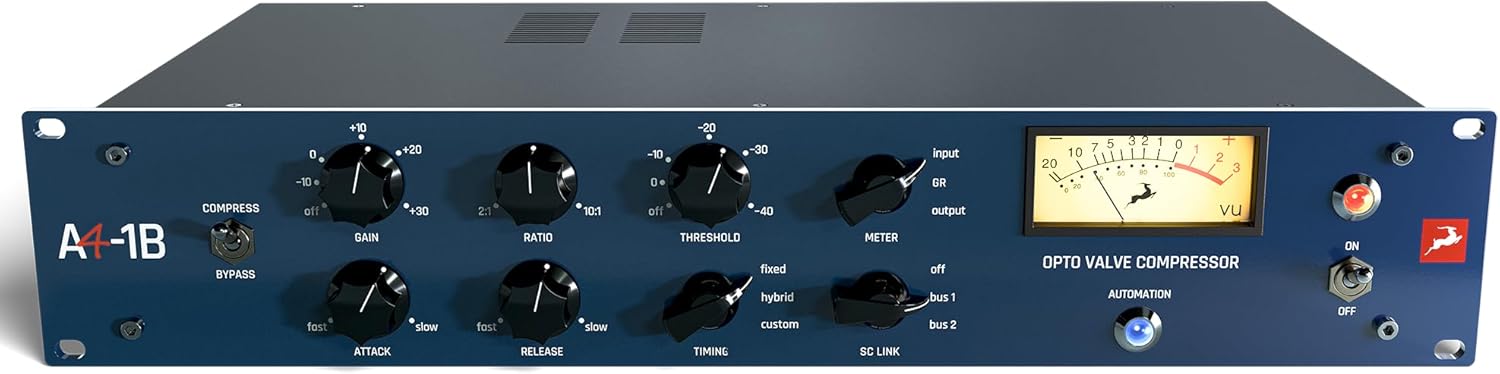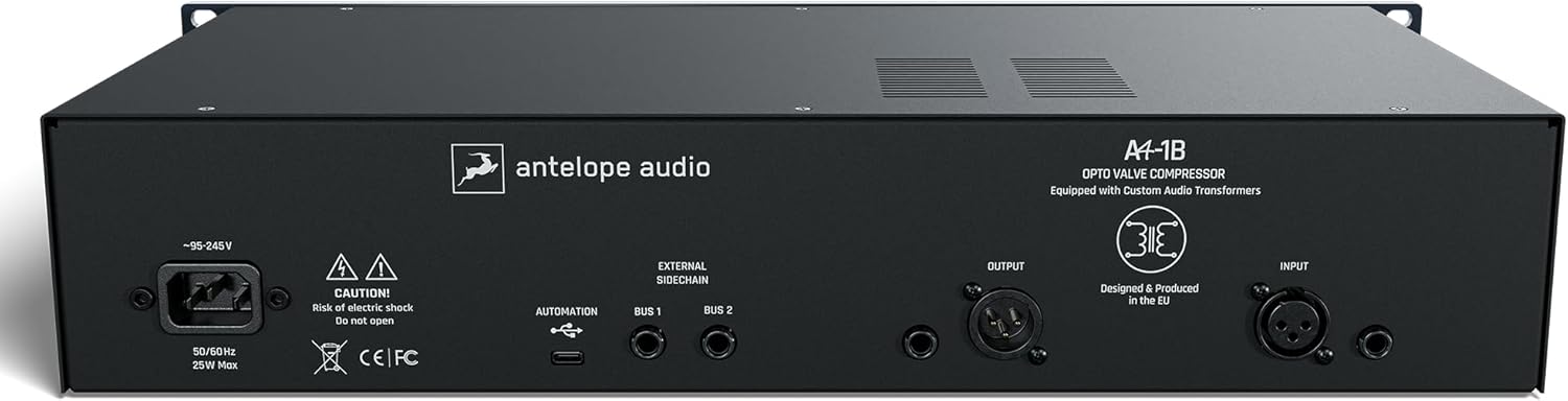 Studio-Grade Analog WarmthDiscover vintage hardware’s rich, musical compression with the A4-1B optical compressor. Hand-selected tubes and custom UK transformers deliver smooth, natural dynamics and enhanced low-end presence. The meticulously crafted analog signal path captures every nuance of your audio, bringing warmth and character to vocals, drums, and full mixes.Precision Control at Your FingertipsTake command of your dynamics with fully variable attack, release, and ratio controls. The A4-1B’s advanced DC tube heating and stable power supply ensure consistent, noise-free operation. Motorized potentiometers respond instantly to your adjustments, while the intuitive interface makes dialing in the desired compression effortless and immediate.Seamless Digital IntegrationBridge the analog and digital worlds with comprehensive DAW compatibility. The A4 software suite enables remote operation via VST3, AAX, and AU plugins. Advanced sidechain filtering and de-essing capabilities provide precise control over your compression characteristicsAutomate parameters in real-time for dynamic, studio-level processing.Features & Benefits-All-analog signal path with hand-selected tubes-Remote DAW control and automation-Variable attack and release settings-Custom UK transformers for rich warmth-Advanced sidechain processing optionsPackage Includes: 1 x Antelope Audio A4-1B Analog Automated Opto Valve Compressor