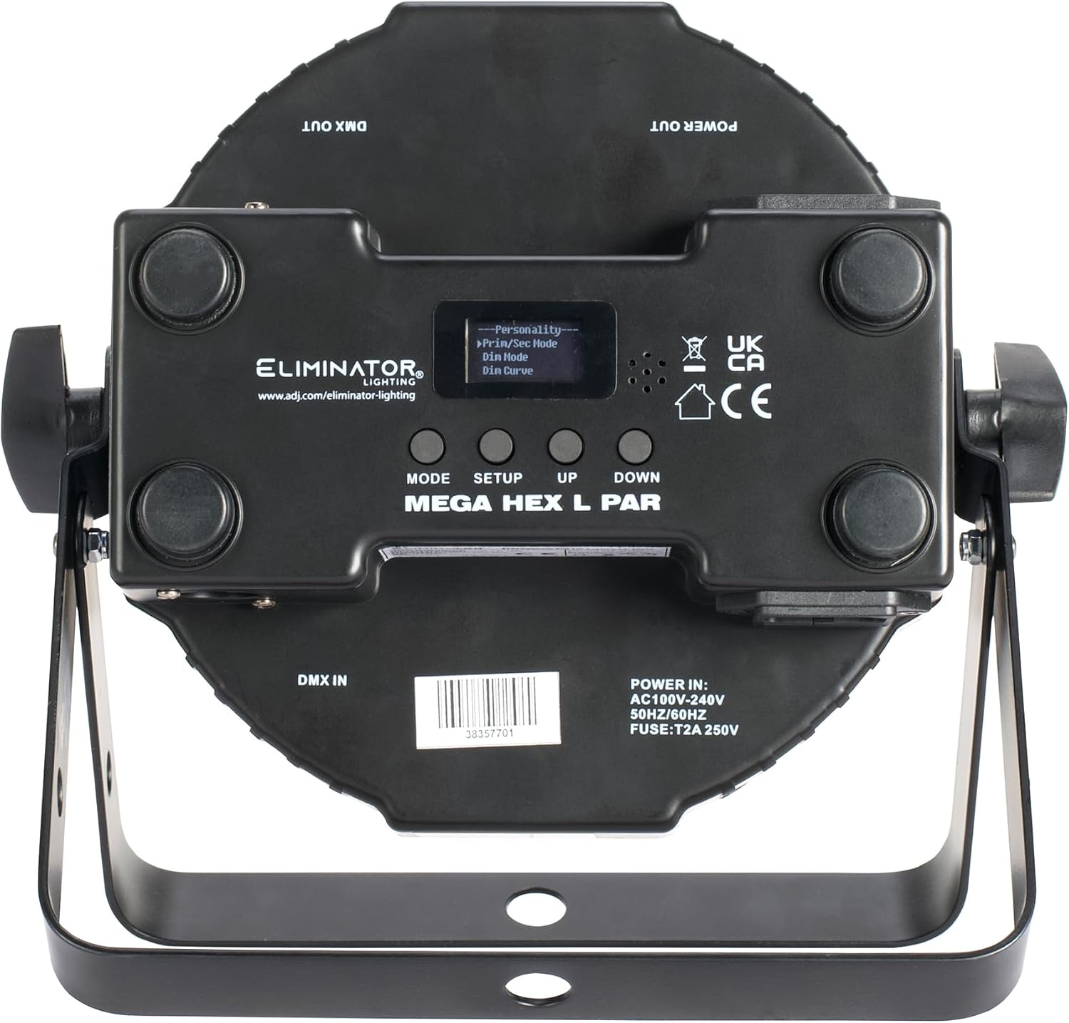 - Package Includes: (3) American DJ Eliminator Lighting Mega Hex L Par RGBLA+UV LED Wash Up-Light+Remote