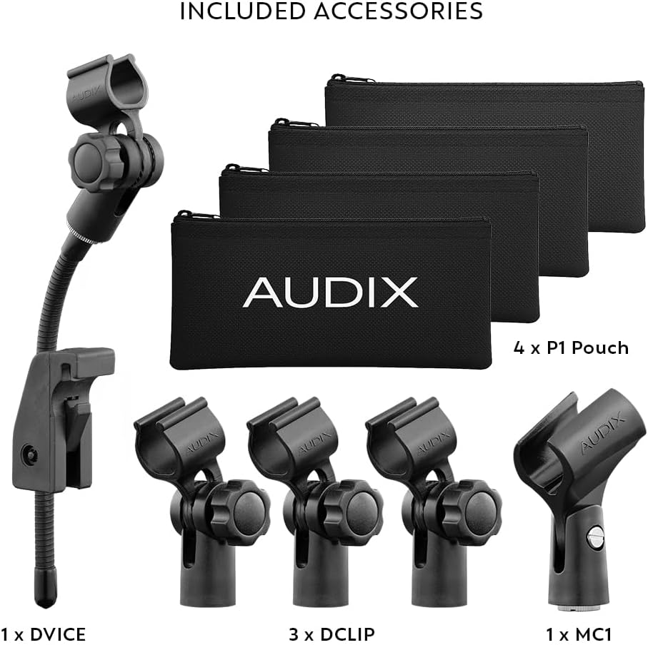 D6X kick drum mic, I5 snare/instrument mic, 2 x F9 Overhead drum mic, DVICE rim mounted gooseneck mic clamp & accessories