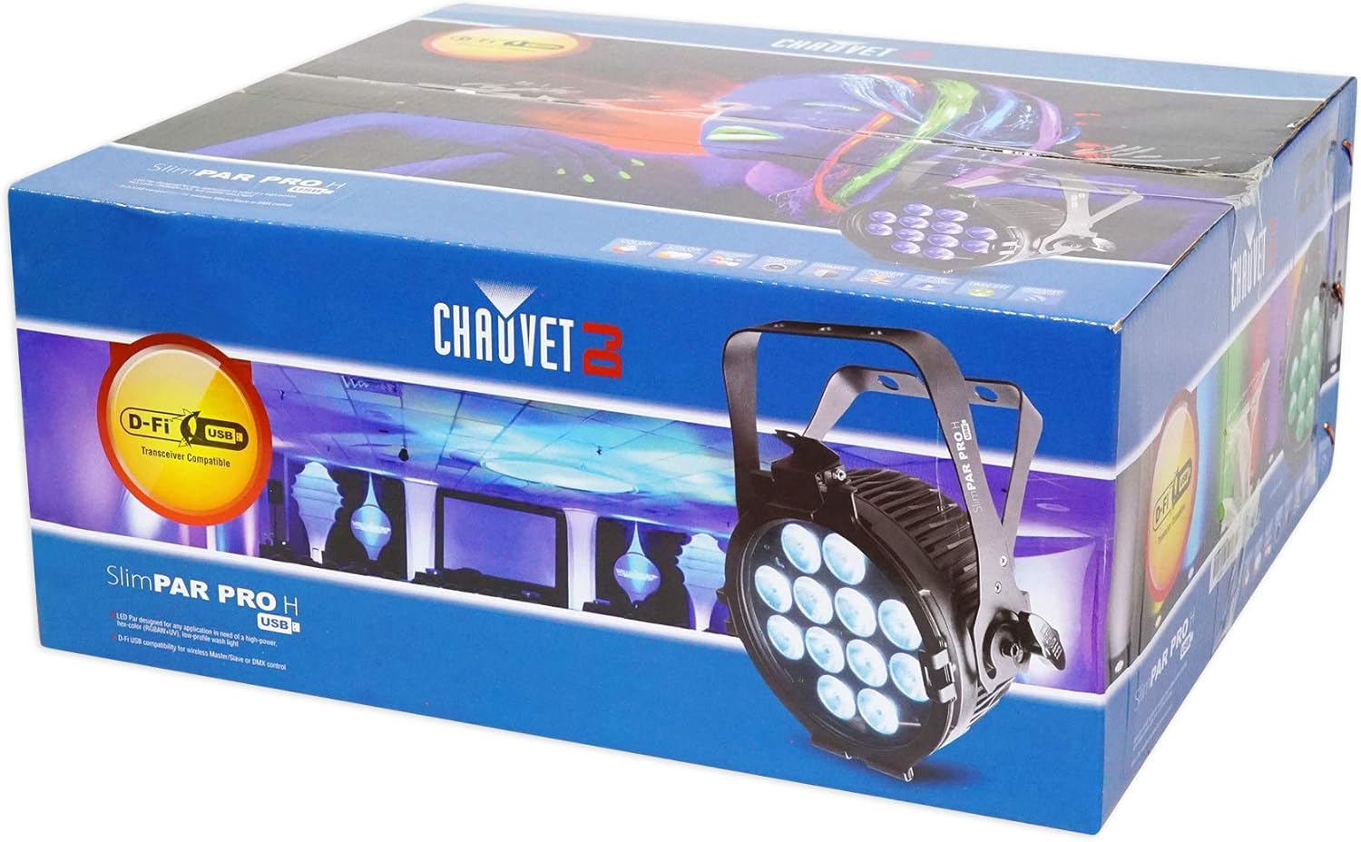 - Features of SlimPar Pro H USB: Chauvet DJ SlimPar Pro H USB D-Fi RGBAW+UV LED Par Can Wash Light Fixture, LED Par designed for any application in need of a high-power, hex-color (RGBAW+UV), low-profile wash light, D-Fi USB compatibility for wireless Master/Slave or DMX control, Compatible with most 7.5” Barndoors for added light control