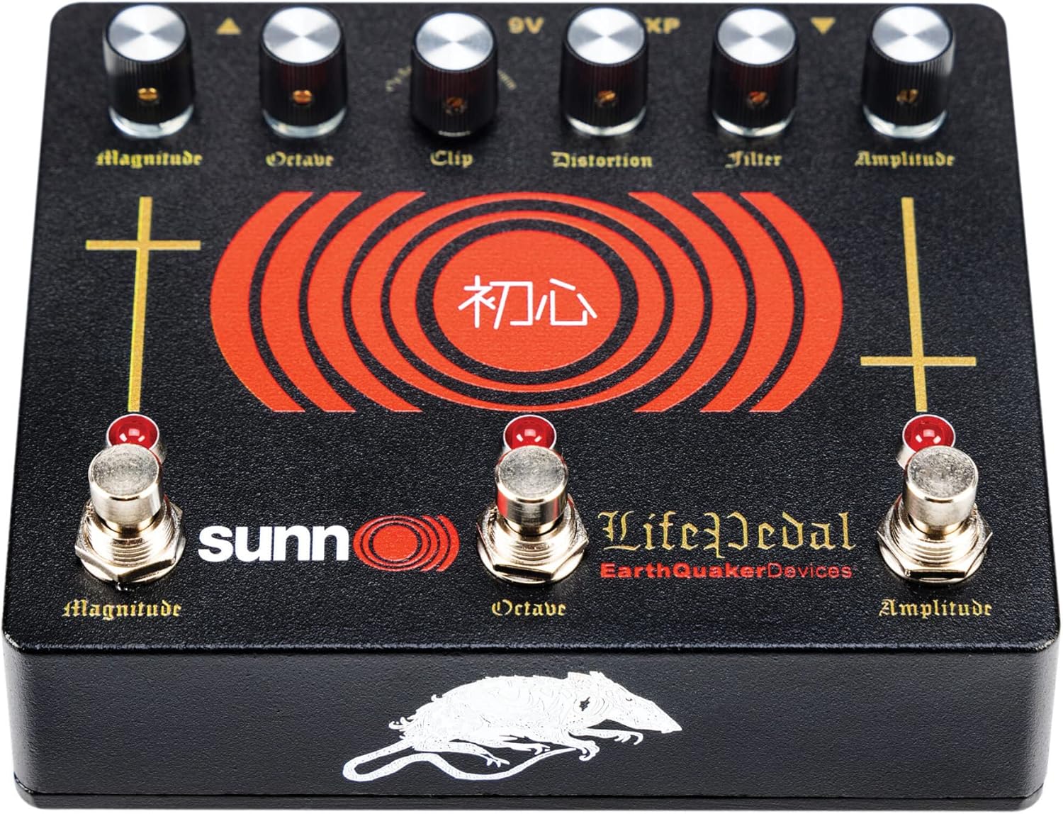 Sunn O))) Life Pedal is a distortion with a blendable analog octave up and a booster combined in one compact package. The “Amplitude” side is faithfully modeled after the classic “White Face” distortion unit, using modern, reliable components to last a lifetime. The only modifications made to the original circuit are in the clipping section. The traditional circuit uses a single pair of silicon diodes for a tight, compressed crunch. The Sunn O))) Life Pedal introduces two additional clipping options to better adapt to different rigs. The first position is no diodes to allow for full, grinding OpAmp distortion at maximum volume. The second position utilizes two silicon diodes and one LED in an asymmetrical clipping configuration. This delivers a slightly compressed and smooth crunch, similar to a valve amplifier. The last position is the stock double silicon diode configuration which provides that classic tone you know and love.