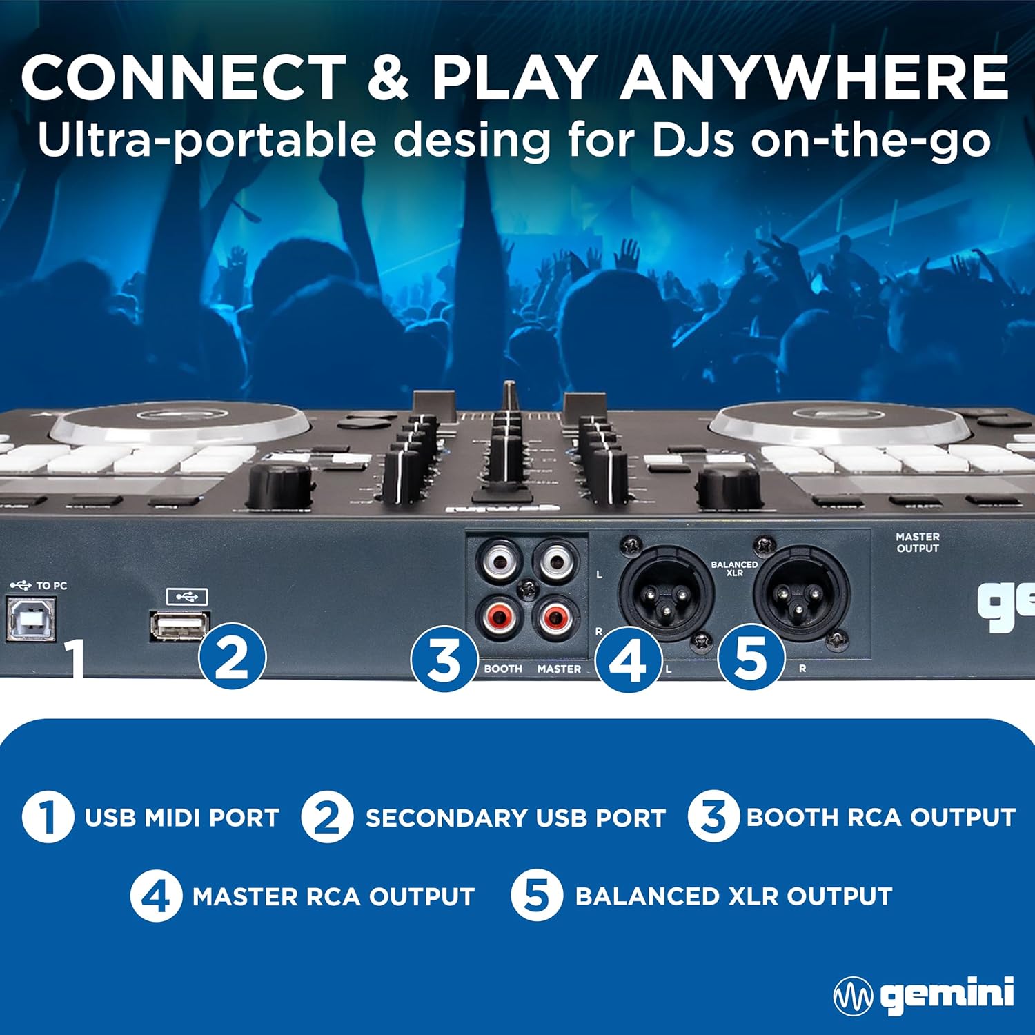 The GMX is versatile: connect to your laptop for DJ software control, or use it standalone with USB drives. Perfect for any DJ setup.
