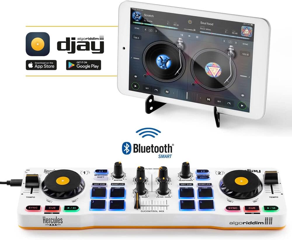 Looking for a portable DJ controller for your smartphone, tablet, or laptop? Check out the Hercules DJControl Mix kit, an ultraportable DJ control surface designed to work with the included Algoriddim djay software, well suited for beginner DJs, home enthusiasts, or professional DJs on the go. The DJControl Mix connects to your smartphone/tablet via wireless Bluetooth or to your Mac/Windows computer via USB, and offers all the key features required for learning to mix and scratch. Two touch-responsive jog wheels allow for cueing and beat matching of their respective tracks, while the on-board crossfader and two volume knobs seamlessly mix the two tracks together. Each deck features a bass-EQ/filter that allows you to enhance the sound, while the available effects sweeten the mix. The controller is USB bus powered and equipped with eight pads, each operating in four modes (hot-cue, loop, FX, and sampler) per deck. The DJControl Mix ships with a USB cable, a DJ splitter cable, and a smartphone/tablet stand. This kit includes the Hercules HDPDJ45 a pair of over-ear closed-back headphones designed for DJs. Their 50mm drivers deliver a 20 Hz to 20 kHz frequency response. The headphones operate at an impedance of 60 ohms, so they will work with most audio sources. What’s in the box Hercules DJControl Mix DJ Software Controller with Algoriddim djay AppUSB CableDJ Splitter CableStand for Smartphone / TabletLimited 1-Year Warranty Hercules HDP DJ45 Closed-Back, Over-Ear DJ Headphones1/4″ Adapter