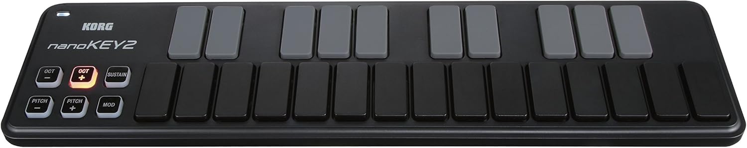 The Octave Shift buttons – borrowed from Korg’s MIDI controllers – allow the overall pitch to be shifted four levels, either UP or DOWN, in octave increments. When used in conjunction with the Key Transpose feature, the nanoKEY2 can access the entire range of the notes in the MIDI spectrum. For enhanced performances, the nanoKEY2 also provides Pitch Bend buttons, a Modulation button, and a Sustain button; one that’s indispensable for piano or electric piano performance.