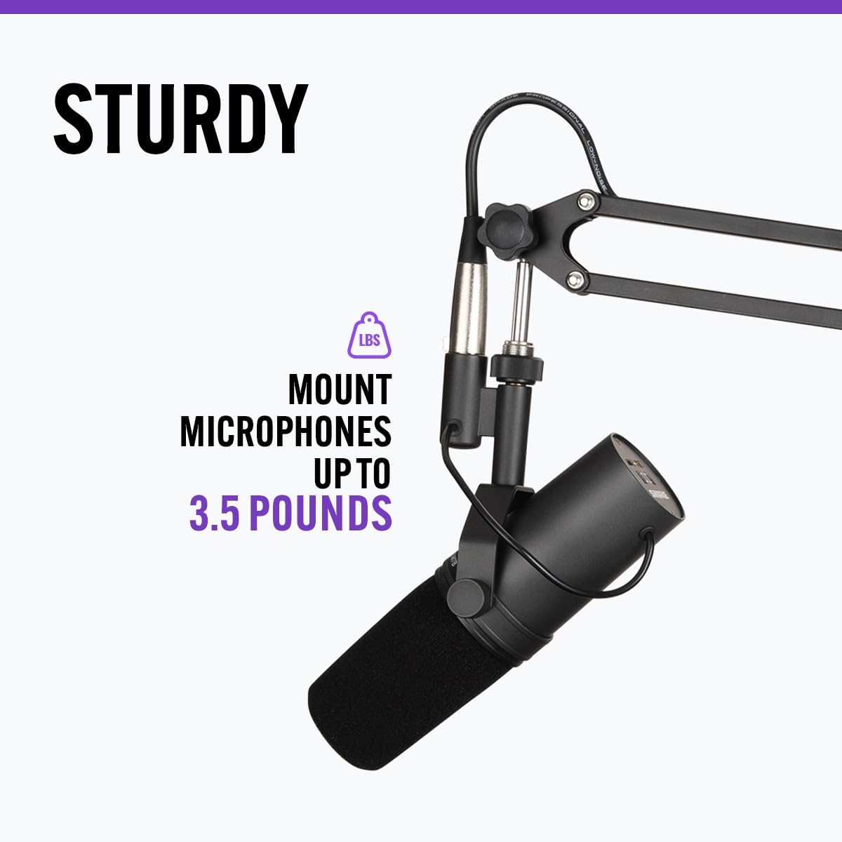 - Organized. Pre-installed 10′ low-noise XLR-to-XLR cable is routed through the tubing for convenient cable management that ensures your broadcast and recording setup looks neat and professional.