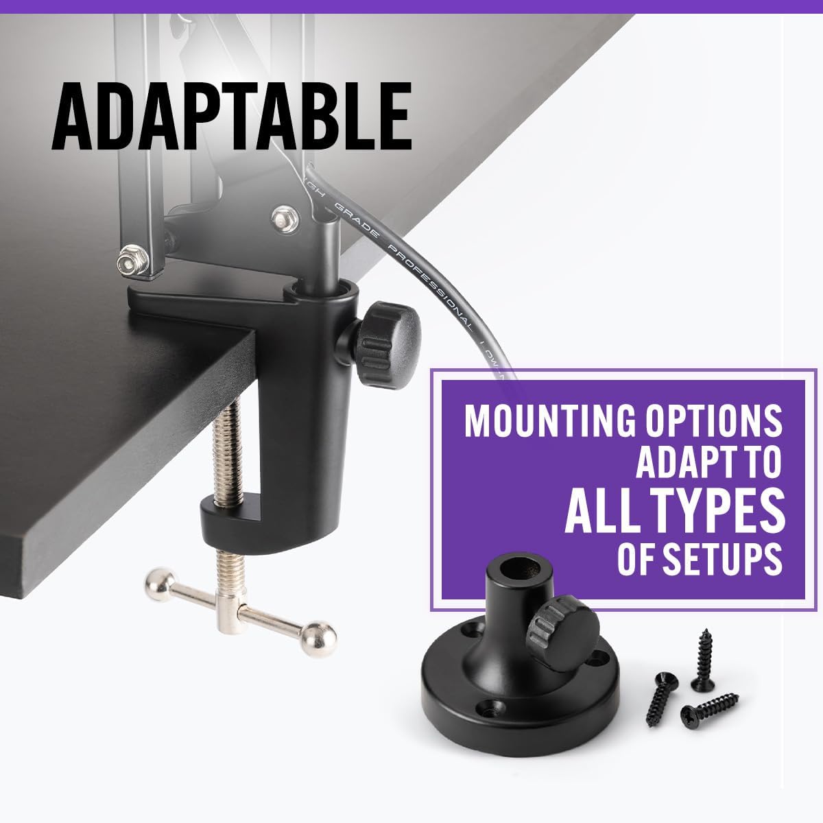 Adaptable. Included C-clamp for quick attachment to desks and tables up to 2″ thick. EVA padding on the clamp protects furniture from scratches and scuffs. A screw-down flange mount is also included for more permanent installation.