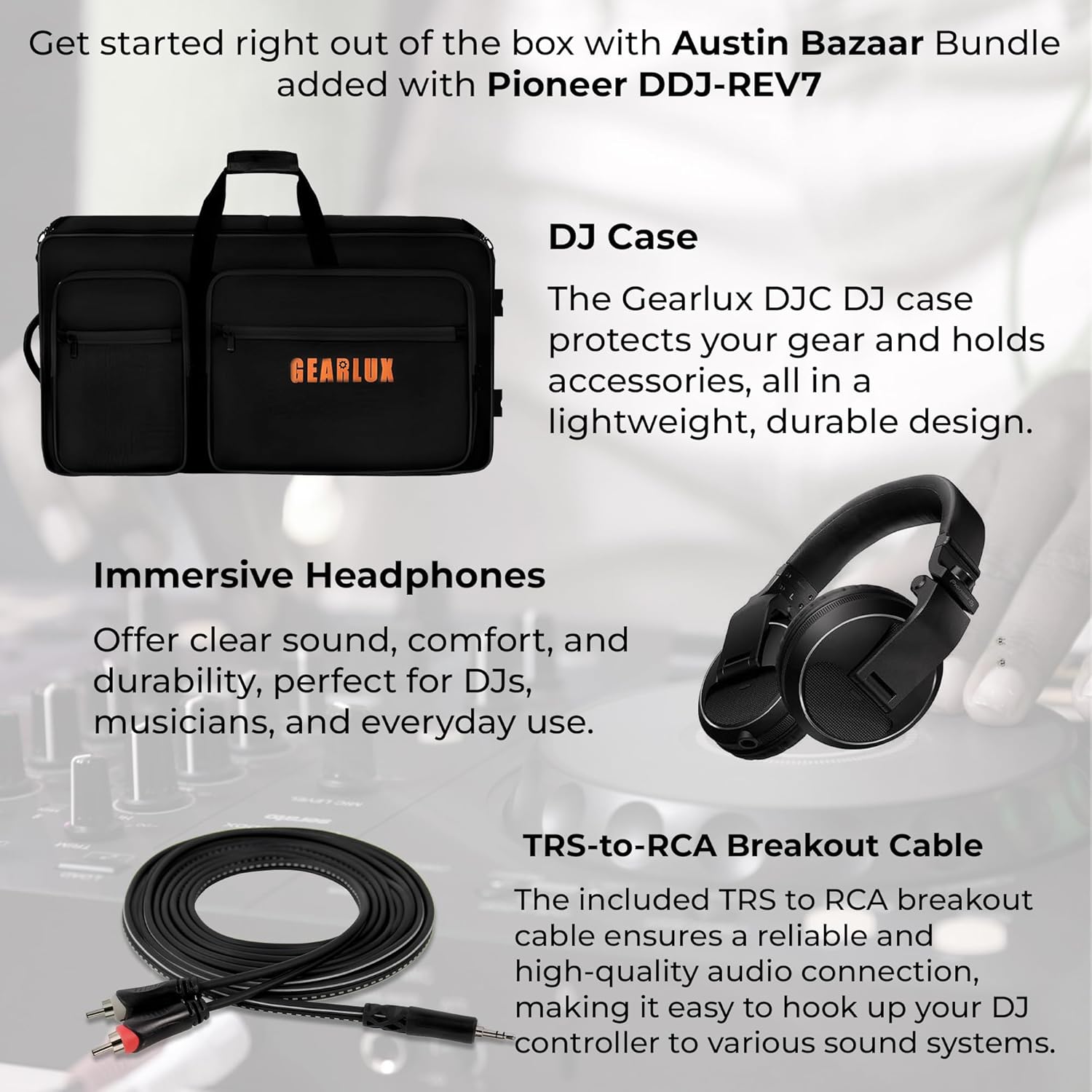 The Pioneer DDJ-REV7 Scratch-Style 2-Channel DJ Controller works perfectly with the free Serato DJ Lite software, offering a user-friendly battle-style layout ideal for both beginners and experienced scratch DJs. Its design is inspired by professional setups, giving you plenty of room to perform mixing and scratching techniques. The controller features 60mm horizontal tempo sliders for smoother pitch adjustments and Performance Pads built into the mixer section for easy access to effects, samples, and scratching. The jog wheels are the same size as those on the higher-end DDJ-SR2, making scratching more precise, while the Tracking Scratch feature simplifies returning to the cue point automatically. Lever FX lets you add creative effects, either in quick bursts or locked on, for more dynamic performances. For the first time at this level, the DDJ-REV7 combines the main audio with microphone input directly, so you can include vocals without needing extra equipment, and stream everything easily through Serato DJ Lite. Dimensions: 526 x 255.5 x 59.2 mm (WxDxH) Weight: 2.1 kg Soundcard: 24-bit/48 kHz Signal-to-Noise Ratio: 103 dB Distortion: <0.005% Power Consumption: 5V 500mA Power Supply: USB Type-B bus-powered Frequency Range: 20 - 20,000 Hz Channels: 2 Deck Control: 4 Trim Knob: Yes Jog Wheel (Maximum Dimensions): 154 mm Filter: Yes Sampler: Yes Hot Cues: 4 Austin Bazaar appreciates your purchase by adding necessary accessories. This bundle contains a case to keep your DJ controller protected, a laptop stand to help keep your laptop at the right angle and an Austin Bazaar polishing cloth to keep your instrument in mint condition.
