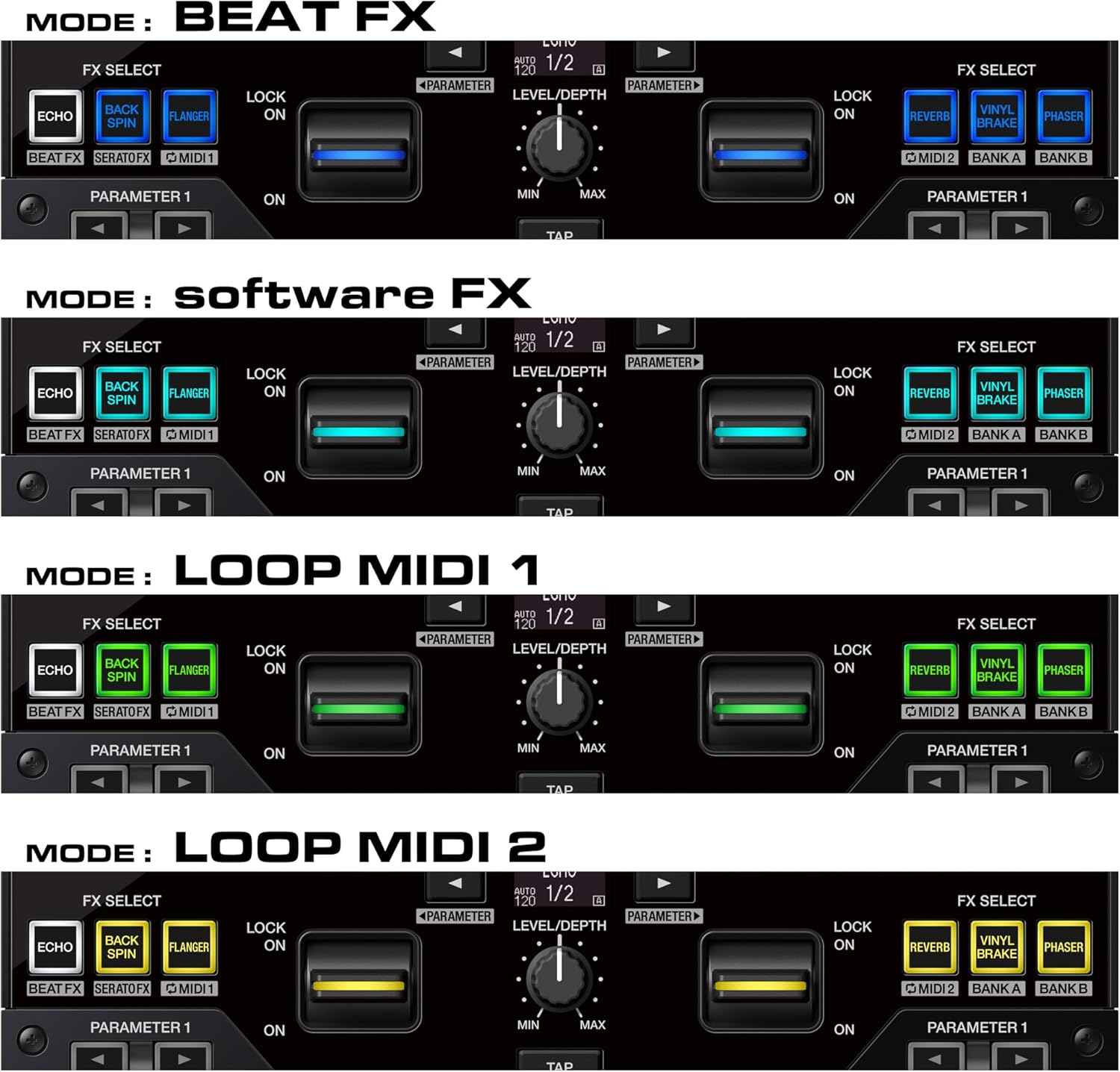 This feature in the effects section of the DJM-S7 can control various functions in your DJ software by repeatedly sending a MIDI signal to the software in a set beat cycle. Functions including Hot Cue, sampler, and key shift-up are preassigned so you can start using Loop MIDI straight away.