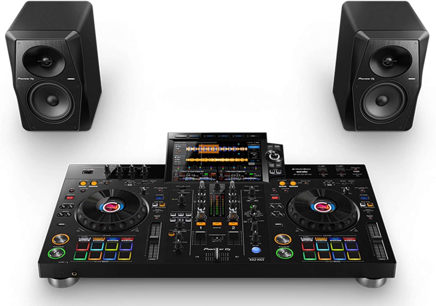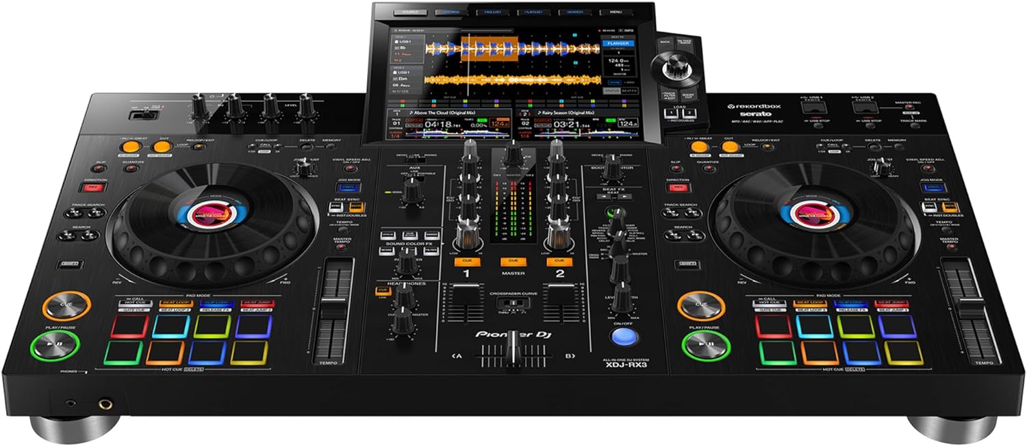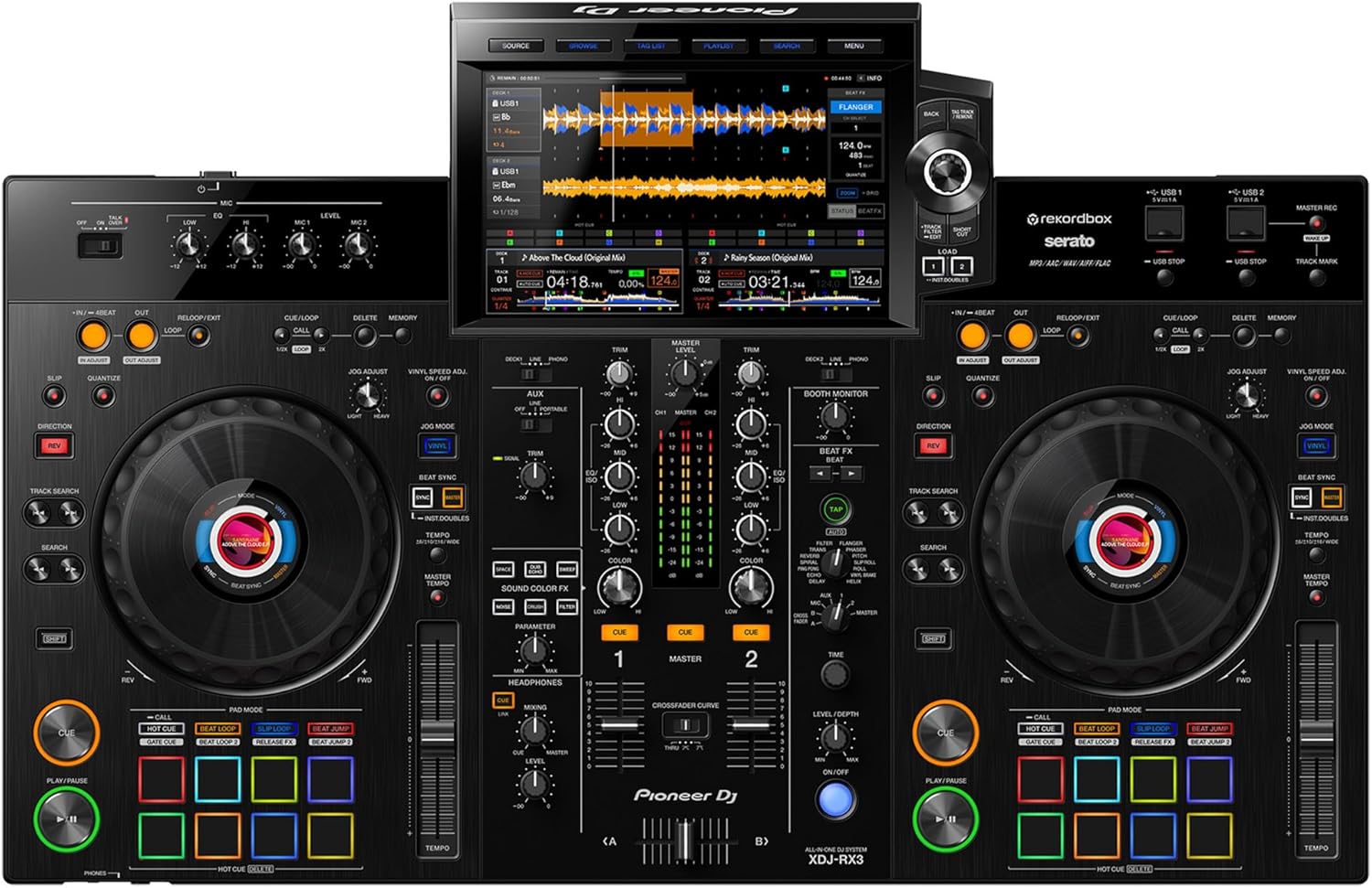The Pioneer DJ XDJ-RX3 is a professional-grade 2-channel all-in-one DJ system that merges flexibility and club-standard performance, featuring technology from the flagship CDJ-3000 and DJM-900NXS2. At its core is a 10.1-inch high-resolution touchscreen, Pioneers largest to date, offering a smooth GUI, fast waveform display, and stacked icons for intuitive navigation and precise mixing. Performance Pads in Release FX mode let DJs energize their sets with 8 effects: Vinyl Brake (Short/Long), Backspin (Short/Long), Echo Out, Build Up, Mute, and Ducking. Each jog wheel features a central LCD screen for visual cues like playhead position or artwork, with improved responsiveness and Feeling Adjust to fine-tune resistance. The RX3 also expands its effects arsenal with all RX2 effects, plus 6 new Beat FX and 2 additional Sound Color FX, totaling 14 Beat FX (including Ping Pong, Filter, Phaser, Slip Roll, Vinyl Brake, and Helix) and 6 Sound Color FX (like Space and Crush). With upgraded controls, enhanced visual feedback, and creative performance tools, the XDJ-RX3 is a powerful, all-in-one solution for serious DJs. Compatible DJ Software: rekordbox, Serato DJ Pro USB Ports: 2 USB-A, 1 USB-B Channels: 2 Sound Color FX: Space, Dub Echo, Sweep, Noise, Crush, Filter Beat FX: Delay, Echo, Ping Pong, Spiral, Reverb, Trans, Filter, Flanger, Phaser, Pitch, Slip Roll, Roll, Vinyl Brake, Helix Mic Inputs & EQ: 2 MIC (XLR & 1/4″), 2-Band EQ Main Outputs: 1 MASTER (XLR), 1 MASTER (RCA) Signal-to-Noise Ratio: 110 dB (USB) A/D Converter: 24-bit Sampling Rate: 44.1 kHz Austin Bazaar bundles your purchase with essential accessories. This bundle contains a case to protect your DJ system during travel, a pair of headphones for reliable audio monitoring, an instrument cable for reliable connectivity and an Austin Bazaar polishing cloth to keep your equipment in mint condition.