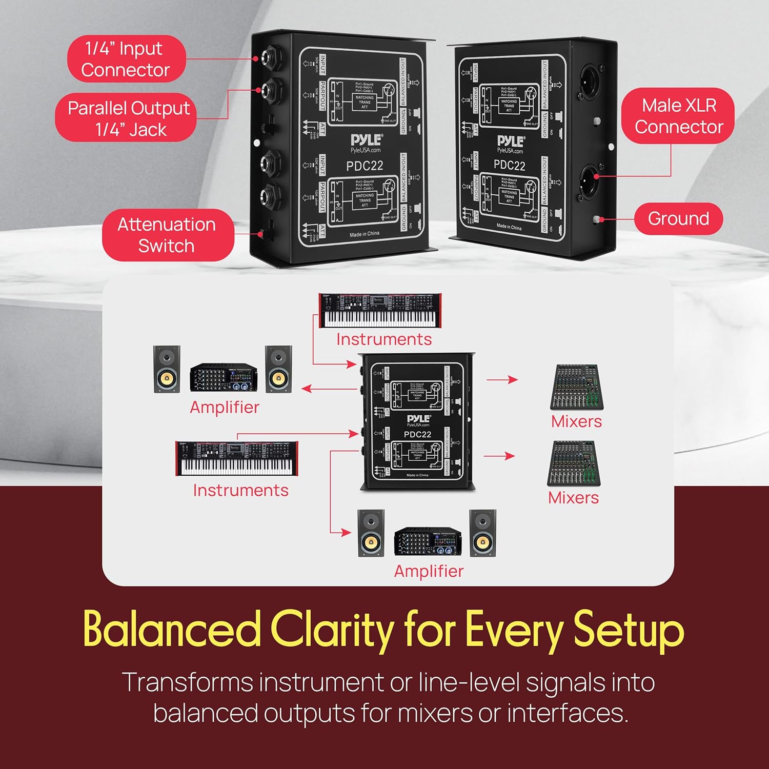 PylePro Model : PDC22 1/4” XLR Direct Box Dual 1/4” Instrument To Balanced & Unbalanced (1/4” XLR) Direct Box Construction: All Steel Chassis Ground Lift: Switch-Able Ground Lift Balanced Output: 600 Balanced XLR Jack Instrument Input: 50K Unbalanced TS Jack..