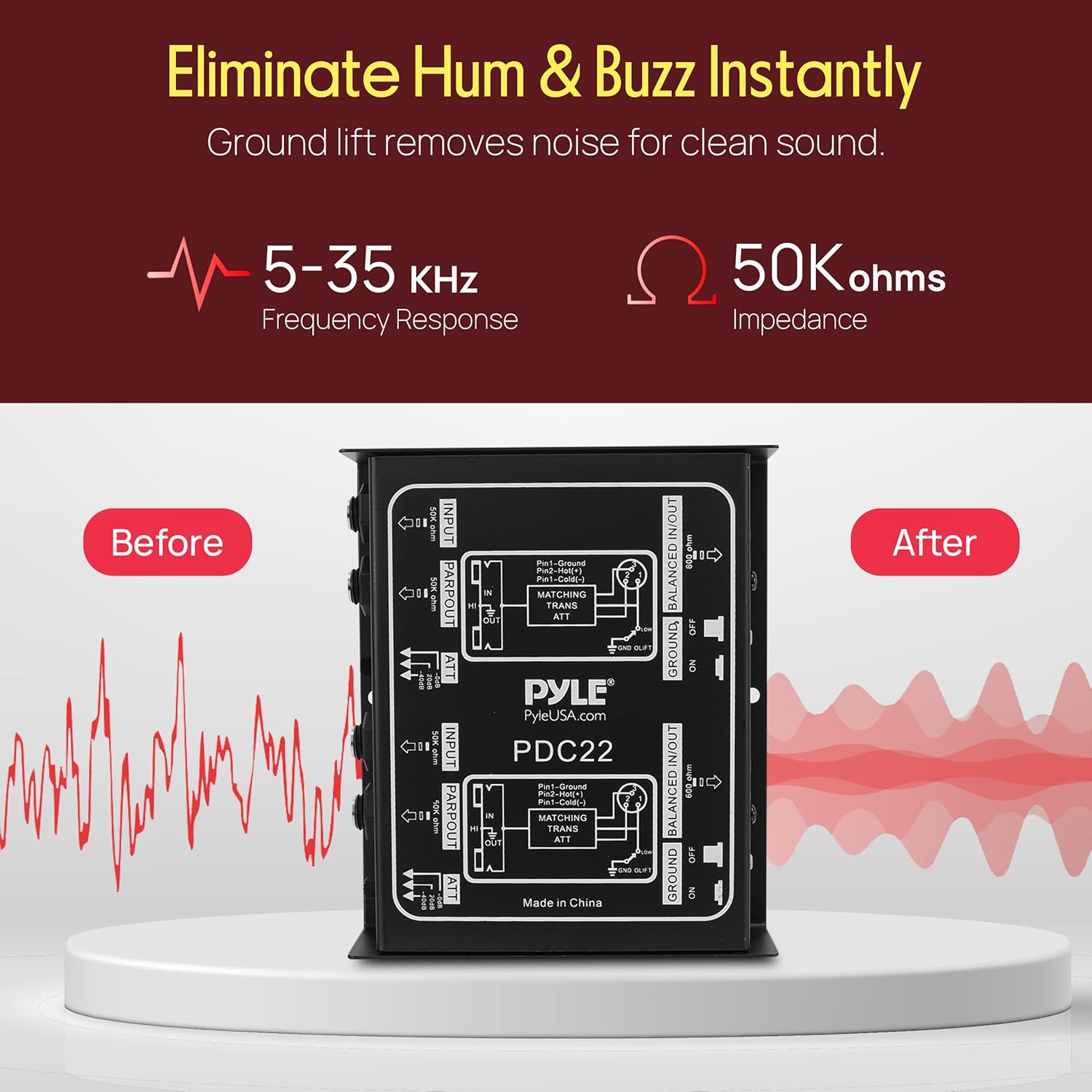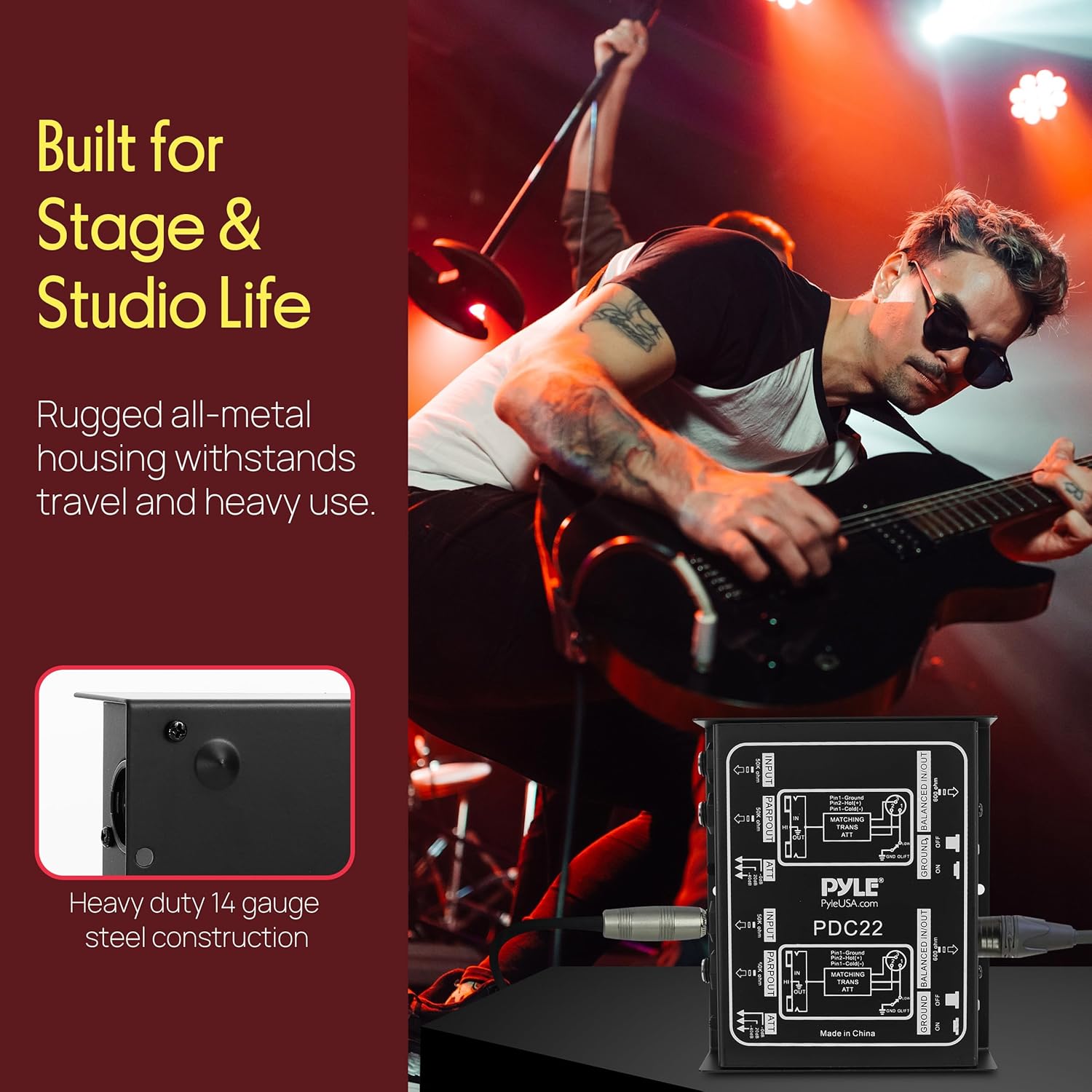 PylePro Model : PDC22 1/4” XLR Direct Box Dual 1/4” Instrument To Balanced & Unbalanced (1/4” XLR) Direct Box Construction: All Steel Chassis Ground Lift: Switch-Able Ground Lift Balanced Output: 600 Balanced XLR Jack Instrument Input: 50K Unbalanced TS Jack Parallel (Link) Out: 50K Unbalanced TS Jack Input Attenuation: Switch-Able (0db,-20db,-40db) Two High-Quality Direct Boxes In One Convenient Enclosure Dimension: 5.5” x 4.72 x 1.57 ” Pyle PDC22 is a necessity if you are looking for the higest quality of sound, with low distortion, noise, and eliminate ground loops. A DI unit, DI box, Direct Box, Direct Input, Direct Injection or simply DI is an electronic device that connects a high impedance, line level, unbalanced output signal to a low impedance mic level balanced input, usually via XLR connector. DIs are frequently used to connect an electric guitar or electric bass to a mixing console’s microphone input. The DI performs level matching, balancing, and either active buffering or passive impedance bridging to minimise noise, distortion, and ground loops. DIs do not perform impedance matching. Pyle has been in business for over 35 years, and their manufacturing experience and expertise is easy to see – and hear.