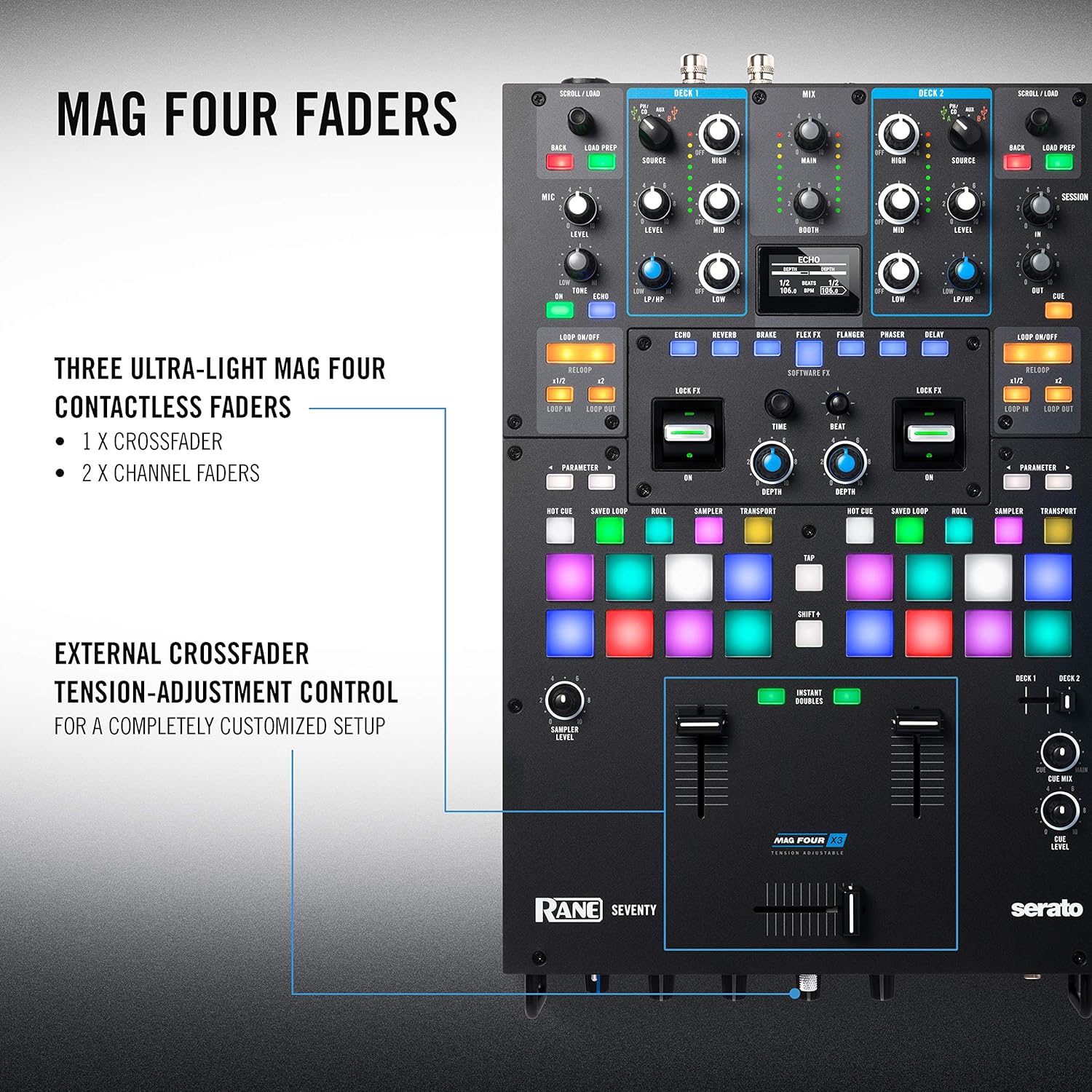 Same DNA, Intuitive Layout Introducing the RANE DJ SEVENTY Serato DJ Mixer Introducing the SEVENTY, the latest addition to RANEs solid steel, Serato DJ battle-ready DJ mixer family. Built from the same intricate DNA that makes every RANE product a standout, the SEVENTY introduces unique new features and an intuitive workflow to push DJ performances to the next level. Packed into a solid, portable mixer, the SEVENTY has the toughness for week-in/week-out touring, satisfying even the most demanding DJs who insist on no-compromise durability, functionality and expressive creativity. MAG FOUR Faders In addition to an ultra-intuitive layout, the SEVENTY introduces three new ultra-light MAG FOUR faders. This new design is the lightest yet and delivers high-quality patented technology, along with an external crossfader tension-adjust. FX, Loops & Instant Doubles The SEVENTYs all new layout has been engineered to put the DJs creative performance capability firmly in the driving seat. Six radio-style DJ FX buttons give instant access to the internal post-fader FLEX FX and Serato DJs software FX. The dual dedicated loop sections and Instant Double buttons are intuitively laid out for immediate, easy access. Performance Pads Centre stage on the SEVENTY are 16 Akai Professional dual layer MPC pads with independent mode controls per deck including Hot Cue, Pitch n Time, Saved Loops, Sampler, Roll and Transport DJ Mixer Mainstays Everything you demand from a mixer is here, perfectly positioned with your performance in mind. A 3-band isolator EQ, plus dedicated high/low pass filters per channel; Serato playlist navigation and control; dual diecast aluminium FX paddles with 180-degree rotation; a radiant OLED display for accurate visual feedback of core mixer parameters. Combine all of this with an industry-leading signal-to-noise ratio of 114dB, the RANE SEVENTY raises the standard of DJ performance to new heights in its category. Flexible Connectivity With the SEVENTY, any performance scenario is covered. Two DJs can perform simultaneously and handover effortlessly via the units dual USB connections. Performance-driven connectivity, including switchable Phono/CD inputs per DJ deck, an RCA Aux line input per deck and an RCA Session input/output for battle teams, provides complete hook-up flexibility. With balanced XLR master outputs, dual 3. 5mm & -inch headphone outputs, and -inch jack booth outputs, whatever your next DJ set needs, the SEVENTY provides. Rounding out the SEVENTYs arsenal of inputs are two switchable line/microphone combo inputs, outfitted with independent level and tone controls, plus echo level for both microphones. Seamless Handoffs Make complicated handoffs a thing of the past with RANEs SEVENTY, two DJs can perform simultaneously and handover effortlessly via the units conveniently located dual USB connections. Are you seeking the authentic DJ experience while retaining all the modern functionality your performance demands? This is your answer! SEVENTY features assignable USB controller inputs for RANE TWELVE motorized control turntable alongside input controls on each deck to switch between dual USB inputs, phono, line and aux channel inputs.