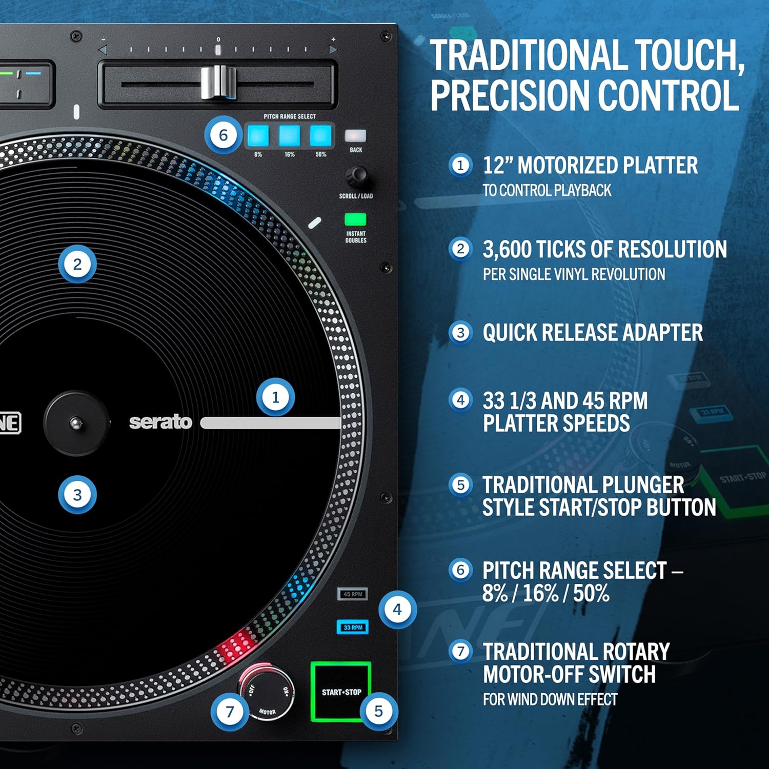 - Total Control of your DJ Set – Dual mode touch strip for track search and 8 hot-cue-triggers; 33 1/3 and 45 RPM platter speeds; 8/16/50% pitch with precise dual-resolution detented slider