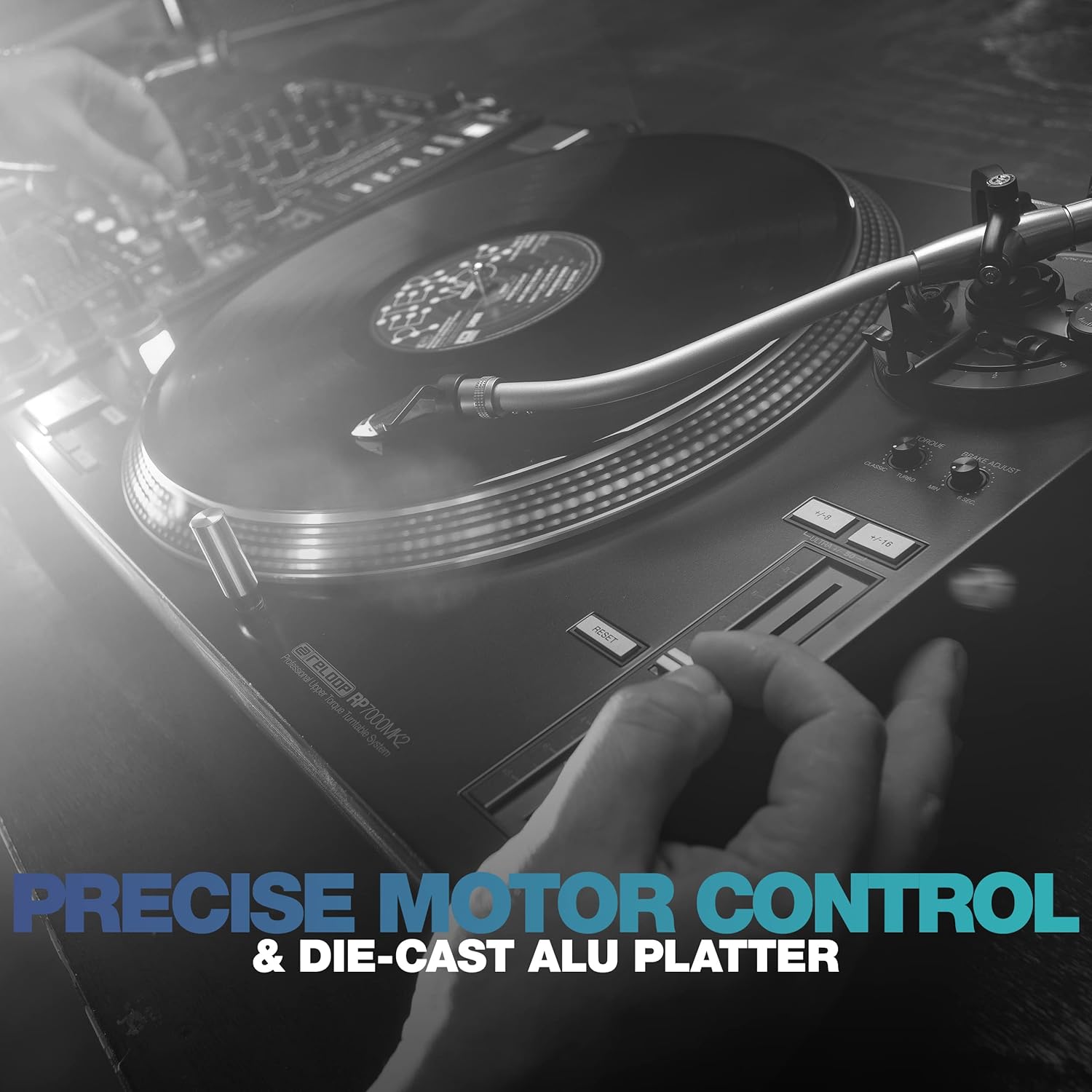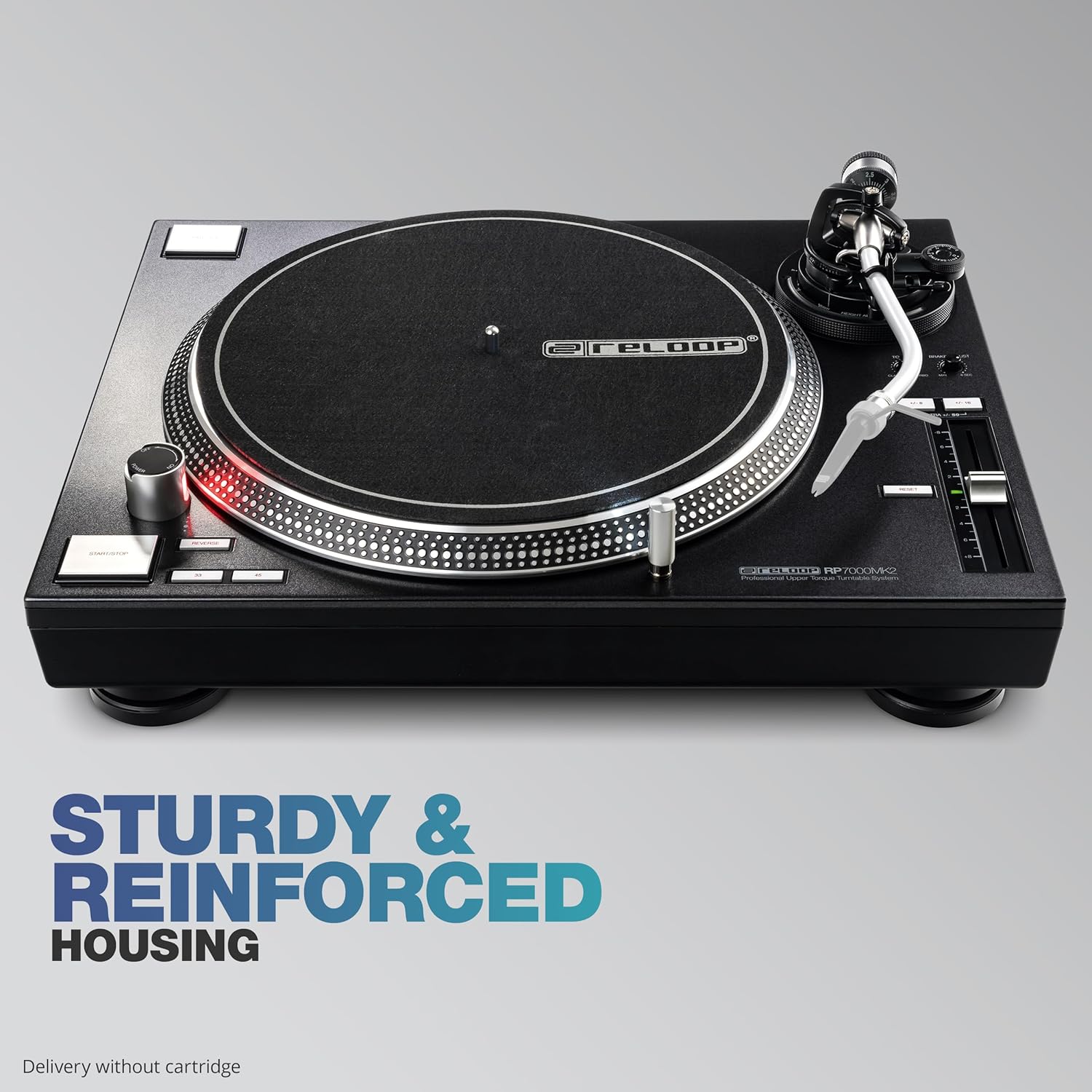 The quartz-controlled DJ turntable is equipped with a strong upper-torque direct drive. By fine-tuning the engine control using digital correction, the synchronization fluctuations of the RP-7000 MK2 could be further reduced, which leads to a particularly smooth running. The starting torque is infinitely adjustable in the range of 2.8 – 4.5 kg/cm, as is the stopping speed in the range of 0.2 – 6 seconds. The heavy, precision-machined, die-cast aluminum platter was designed to reduce vibration and Resonances provided with a rubber insert.