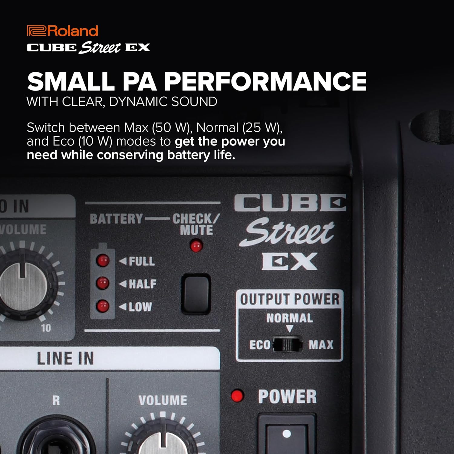 - Innovative new Roland technology provides 50 watts of stereo power from eight AA-size batteries
