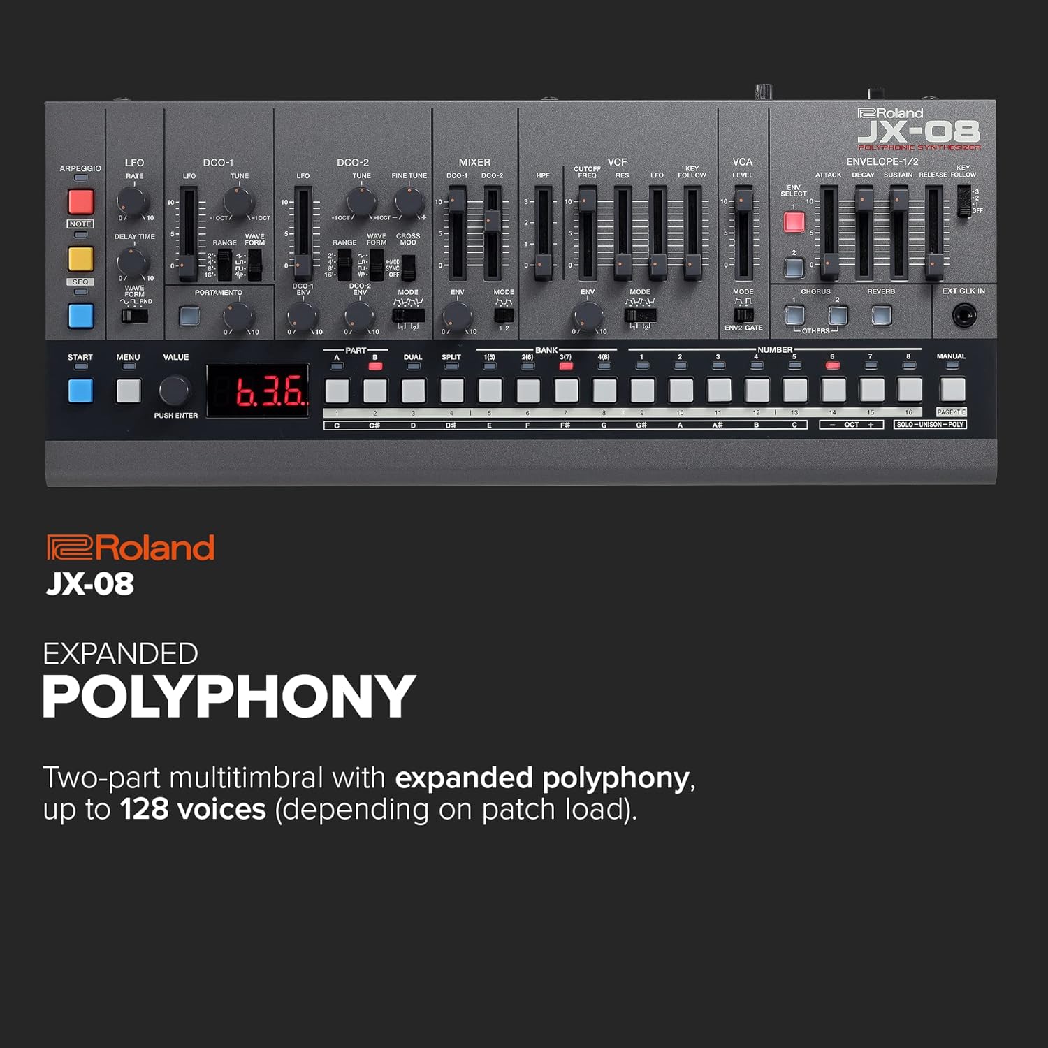 Roland JX-08 An 80s icon on your tabletop. In 1985, Rolands innovative JX-8P took hybrid synthesis a step further with a compelling new analog-digital voice. The instrument was instantly embraced by top session players, who forever embedded its warm pads, shimmery chorus, and crystalline textures into the eras most popular tracks. The JX-08 reintroduces the unique sound of this sought-after classic in stunning detail, coupled with powerful new effects, a polyphonic sequencer, and more. And to enhance your creative flow, theres a full panel of hands-on controls derived from the companion PG-800 programmer unit for the original hardware.