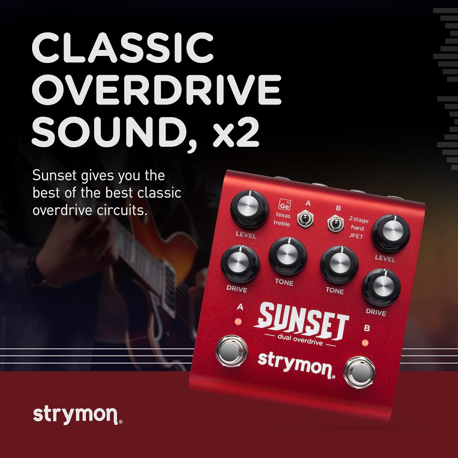 - CLASSIC OVERDRIVE SOUND: The Sunset overdrive guitar pedal combines six iconic drive circuit types into a two-channel pedal for a wide range of tones. Enjoy custom versions of some of the most sought-after classic drive pedal designs, all in one pedal.
