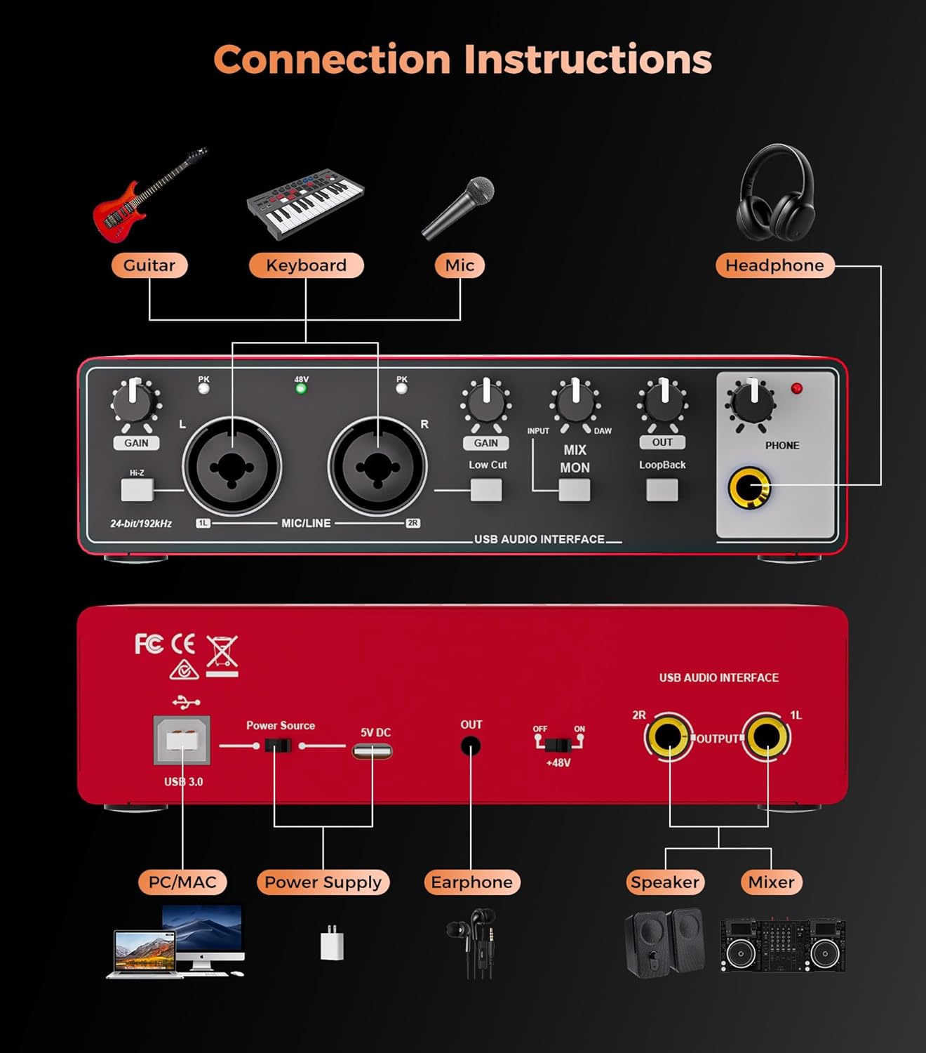 - Professional-grade Audio Quality (24-bit/192kHz): Studio-QUALITY Recording, The audio interface delivers studio-quality clear recordings, accurately capturing every detail of vocals and instruments, meeting broadcast-grade audio quality requirements. our advanced circuitry eliminates that annoying background hiss, Meanwhile the headphone jack enables zero-latency, low-noise monitoring.