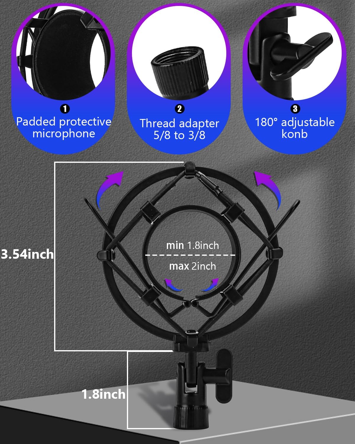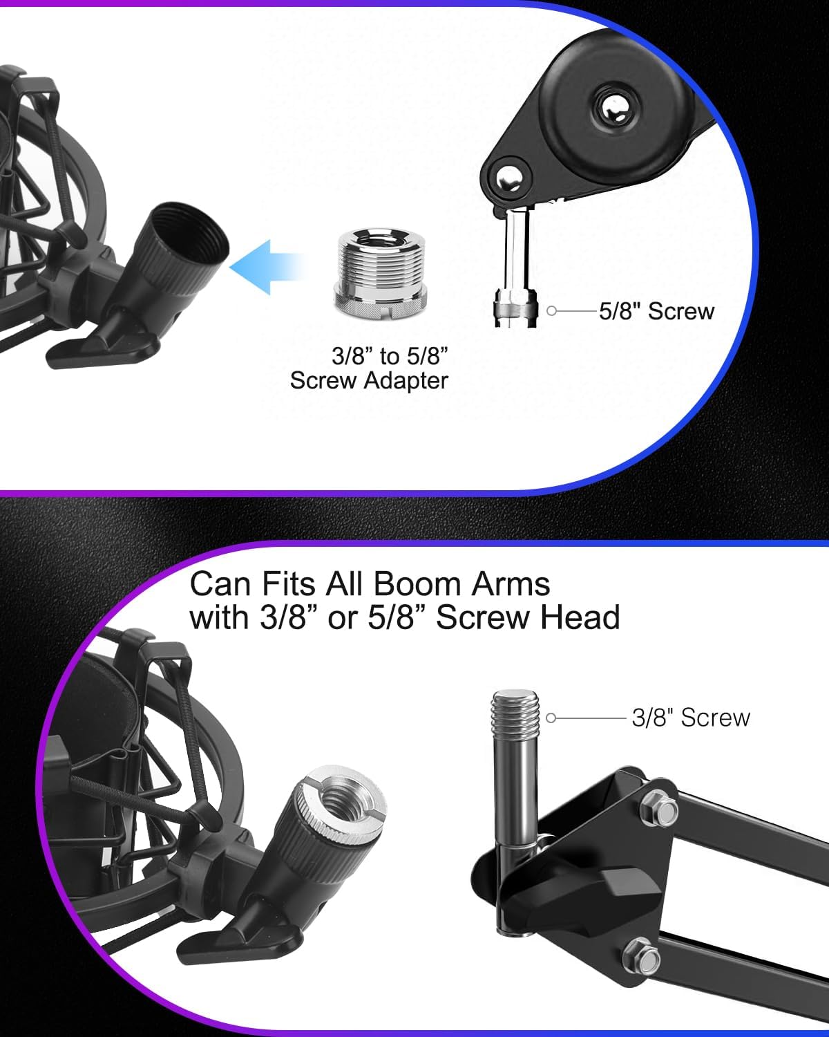 Features an angle adjustable locking knob with a 5/8″ screw hole, and we provide a 5/8″-3/8″ screw adapter in the package, which can be easily connected to any microphone boom or stand.